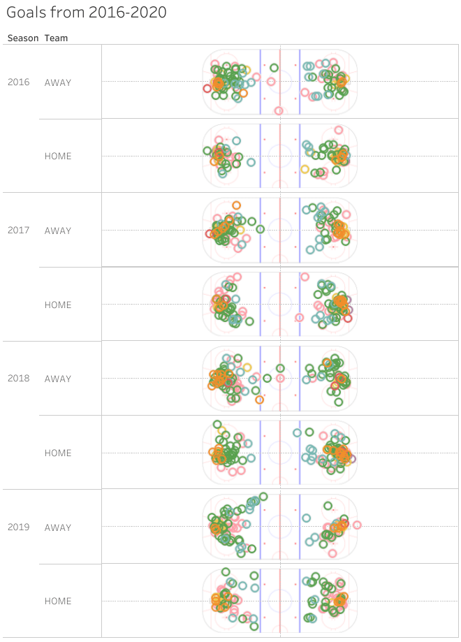 This last visualization features goals from the Devils and their opponents. Let’s break this down a little bit. When the shot map more clearly represents a “C” shape, it shows that the team was using all players on ice to their advantage and working as a team in order to score a goal. In 2016 and 2018, the Devils were the worst in the Metropolitan division, and the shot maps show a very little resemblance to the “C” shape. What’s worse is that their opponent’s maps were similar, meaning they most likely dumbed down their playing to match the Devils. The goals scored by away teams are also dispersed farther from the net, showing the ease of scoring against them in these two years. In 2017 and 2019, the better seasons of the four, there is a closer resemblance to a “C” but still show the away team’s ability to score farther from the net.