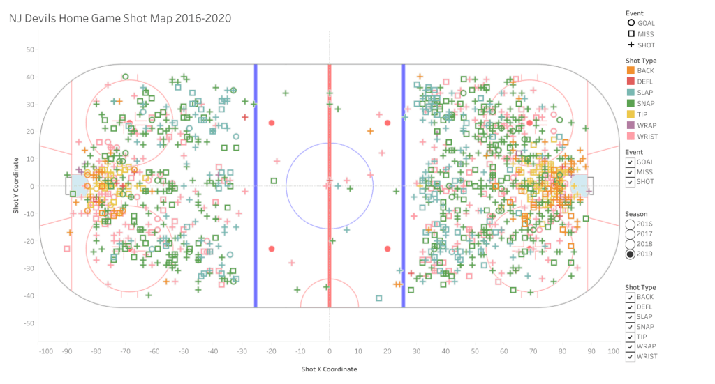 My interactive data visualization focuses on exploring the NJ Devils’ home game shots from 2016 to 2020. The goals for the final visualizations were to see whether there were any strategy changes over the four years, what type of shot was most popular depending on where the shot was made on the ice, and to see how they compared in shooting relative to their competitors. As a Devils fan and former hockey player, I was extremely interested to see what insights I could find through these visualizations.