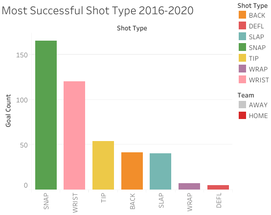 This visualization gives great insight into which shots were most popular depending on where the players were on the ice. Tip, wrap, and back shots seem to be very condensed by the goal, while slap shots are most prominently used between the top of the circles and the blue line. Tip, wrap, and back shots are quick and deceptive shot styles, making them a good option when the player is close to the net, but can easily be blocked by a goalie and require good coordination to be successful.